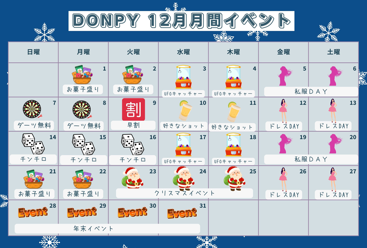 錦糸町ガールズバー「ドンピー」は毎月様々なお得なイベントを開催しています!イベントをチェックしてお得に楽しくご利用ください。